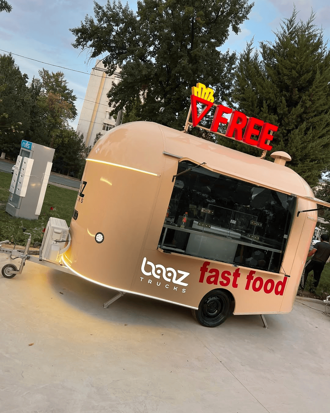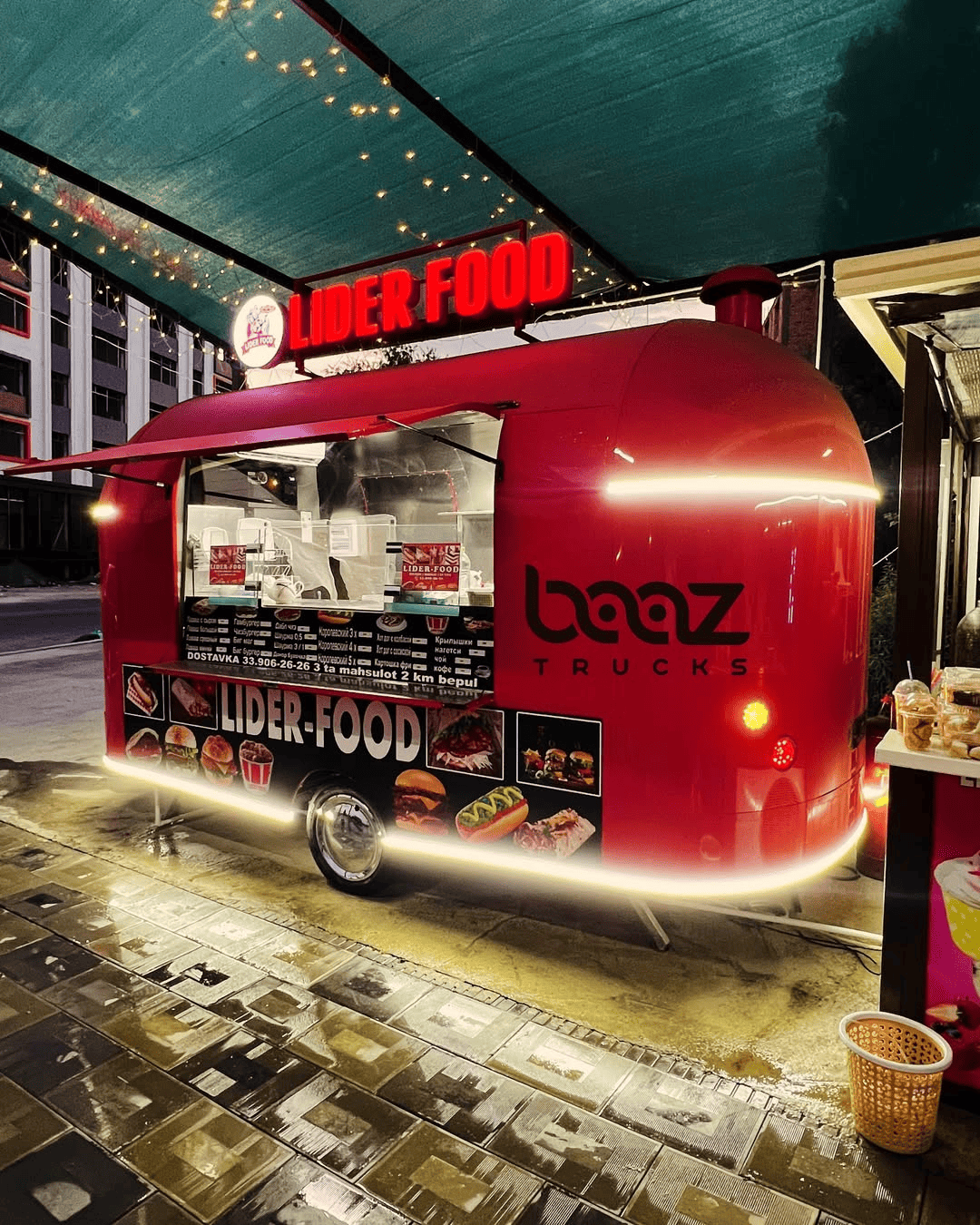 Baaz Trucks — bu sizning ishonchli food truck hamkoringiz. Biz ko‘chma oshxona yechimlarini taqdim etib, biznesingizni tez boshlash va rivojlantirishga yordam beramiz. Zamonaviy dizayn, sifatli uskunalar va qulay xizmat orqali mijozlaringizga har doim issiq va mazali taomlar yetkazishingiz mumkin.